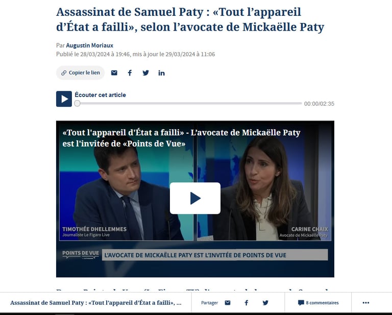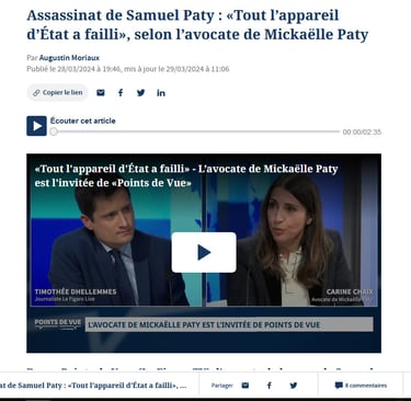 « Nous déposons ce recours pour que justice soit faite, et ce n’est pas rien, puis pour que cessent ces renoncements qui tuent », affirme Me Carine Chaix dans Points de Vue (Le Figaro-TV). Une première démarche, donc, qui invite l’État à reconnaître sa responsabilité dans l’assassinat de Samuel Paty. En l’absence de réponse de l’administration d’ici le 17 mai, et tant qu’il n’y aura pas de « reconnaissance pleine et entière, officielle, de sa responsabilité », l’affaire poursuivra son chemin juridique et un recours contentieux devrait être porté devant le tribunal administratif. Ce à quoi Mickaëlle Paty ne dérogera pas « car c’est une combattante, elle ira jusqu'au bout », ajoute celle qui échange quasi quotidiennement avec sa cliente.